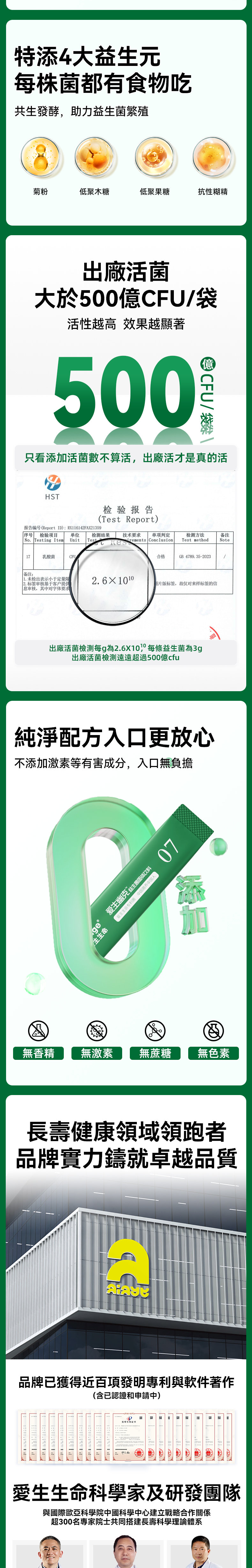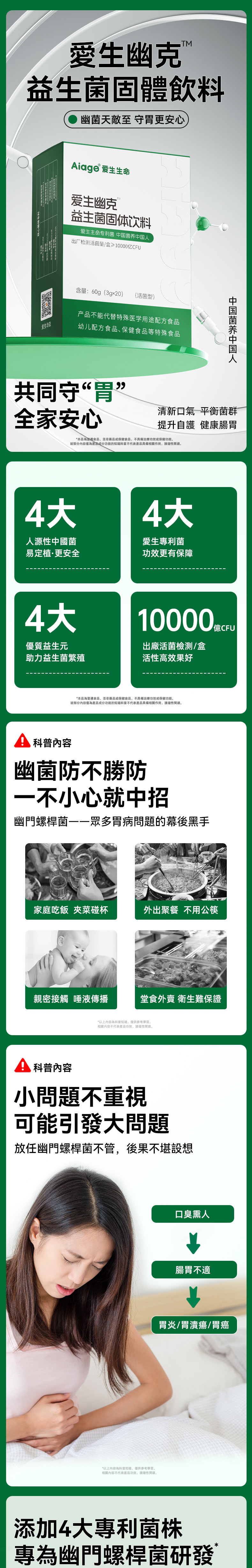 產品配方特別添加4種具有抑制幽門螺桿菌生長、定植功能的長壽人源菌株A21358、A21136、A21149,以及同時具有抗炎作用的A21325,搭配多種益生元,靶向清除有害菌,養護腸胃好生態。額外添加可滋補養生、強身健體的猴頭菇粉和岩藻多糖,藥食同源配方,成分天然安全無依賴。