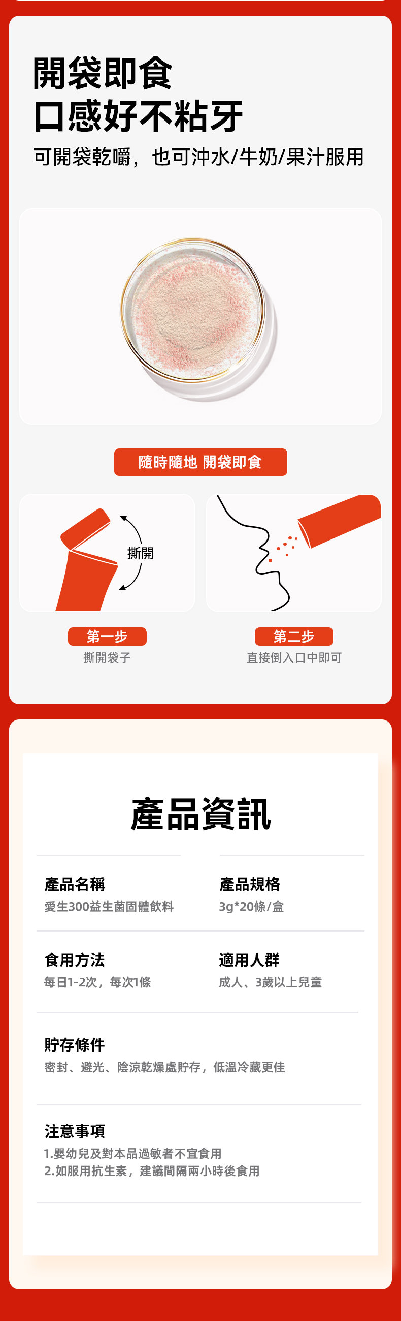 食用方法:開袋即食或加入溫水(≤40°C)牛奶、果汁等調勻食用,每天食用1-2條,建議長期食用調理腸道微生態。