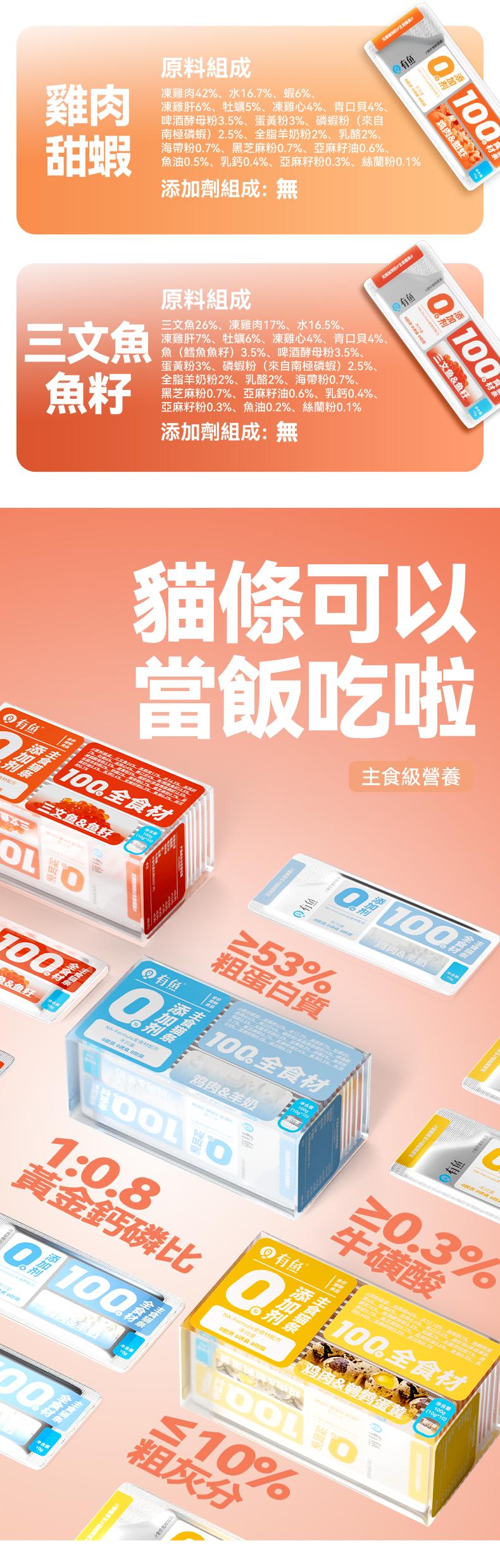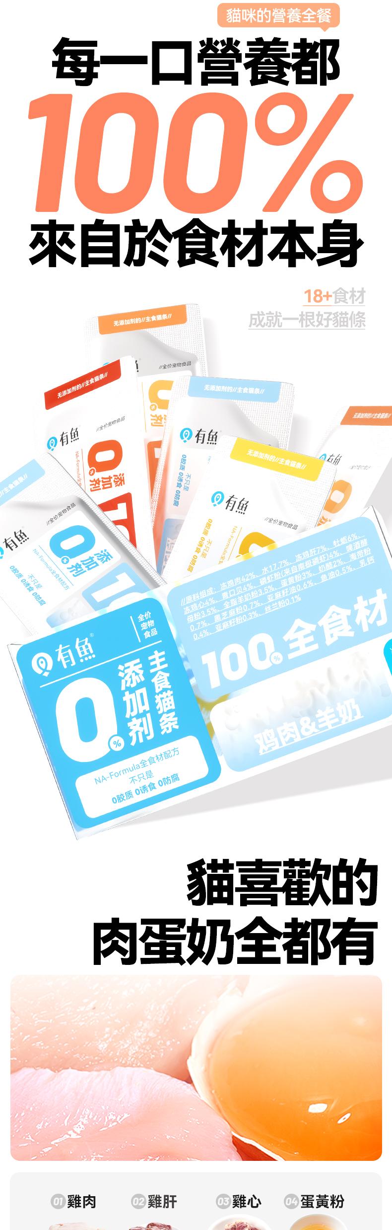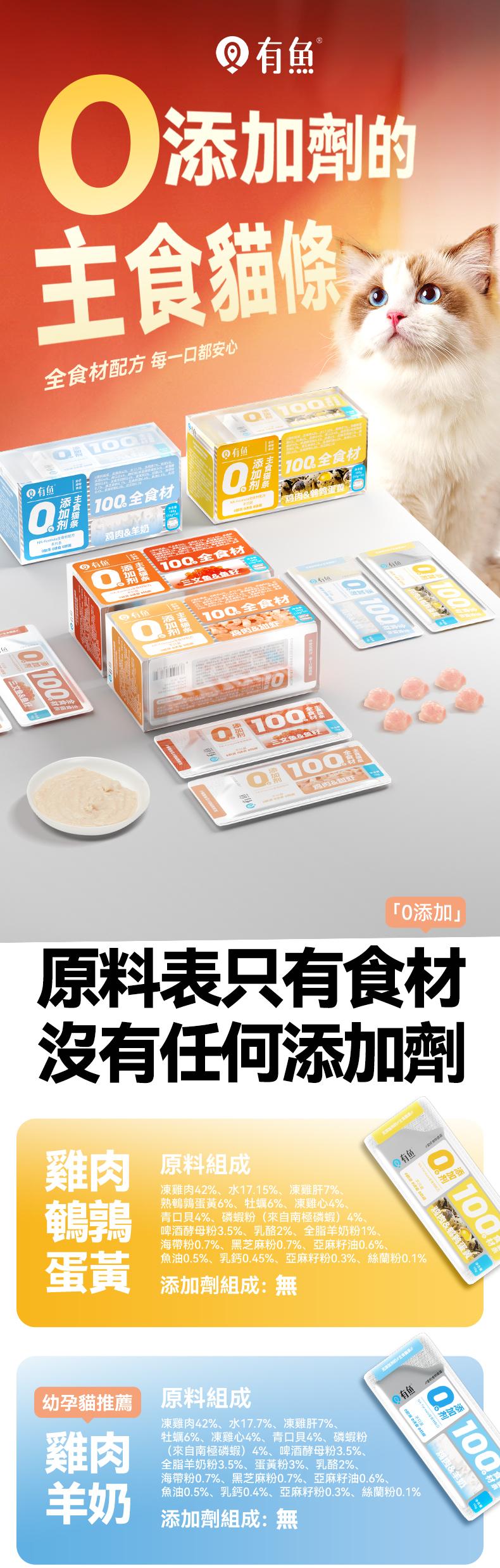 有魚 0添加主食貓條【雞肉&鵪鶉蛋黃口味】/【雞肉&羊奶口味】/【三文魚&魚籽口味】/【雞肉&甜蝦口味】